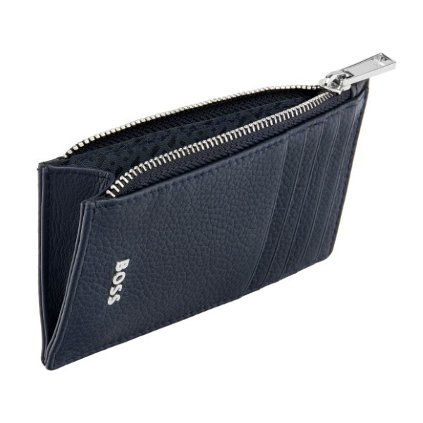 The Classic Grained line is crafted from carefully selected top-grain leathers, defined by a grained texture that conveys a timeless and sophisticated appeal. Each piece is skillfully assembled and beautifully finished with a crisp chrome BOSS signature plate and a tone-on-tone monogram lining, highlighting refined craftsmanship. Available in navy, camel, and black, this zipped card holder is designed around a spacious main zipped section with a gusset, and features five card slots on the front — balancing practicality with understated elegance.