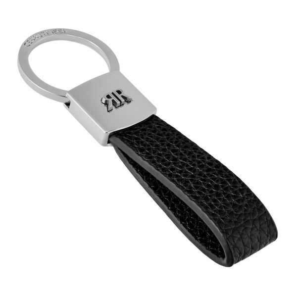 The Jefferson keyring in black combines grained vegan leather with crisp chrome accents to create a functional, minimal aesthetic rooted in timeless elegance. Its clean lines and refined contrasts highlight the sharp, architectural presence of the new CERRUTI 1881 3D RR logo, making it a modern essential crafted with purpose and clarity of design.
