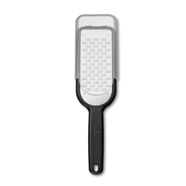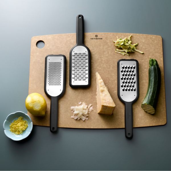 * Take the strain out of food prep with the ribbon-blade Grater. The etched, stainless steel blades are ideal for grating semi-hard cheeses, chocolate or even fruits and vegetables. Non-slip feet ensure a safe, solid hold while working with the grater. For convenience, the Swiss Made tool is dishwasher safe.