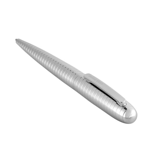 The Contour Bauhaus pen builds on the rounded, ogivoidal silhouette that has become a market favorite, with every line curved to create a fluid, seamless profile. Spaced horizontal lines bring an architectural, futuristic vibe, making the cap and barrel read as one continuous form. Plated in shiny finishes and signed with a HUGO BOSS logo on the clip, it comes in crisp chrome or deep, shiny black