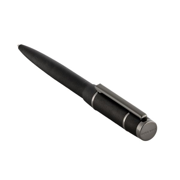 The Rive ballpoint pen expresses a modern, graphic design language that showcases the new Double B logo through controlled contrasts of metal finishes. Its tight diamond-cut surface is set against smooth black and gunmetal trims, logo, and accents, creating a sharp, architectural presence. The 3D Double B logo adds depth and precision, while the HUGO BOSS logo at the top signs the piece with a refined, contemporary edge.