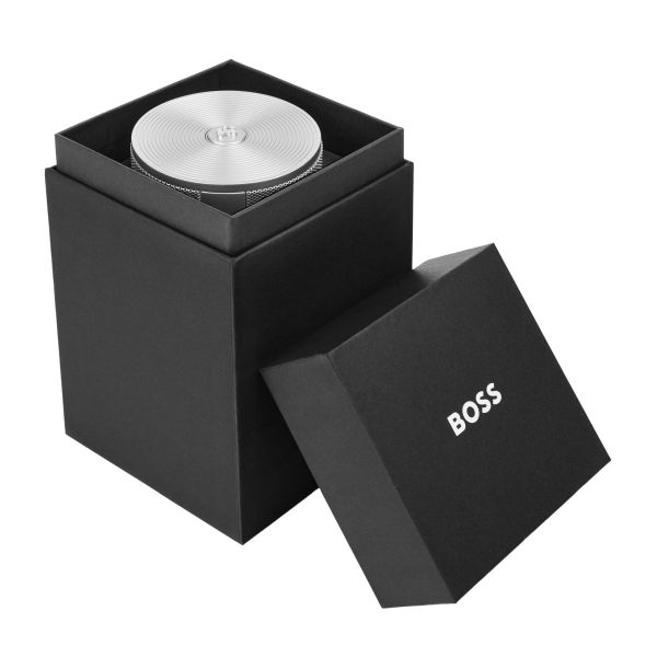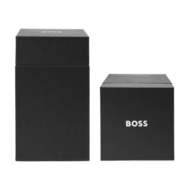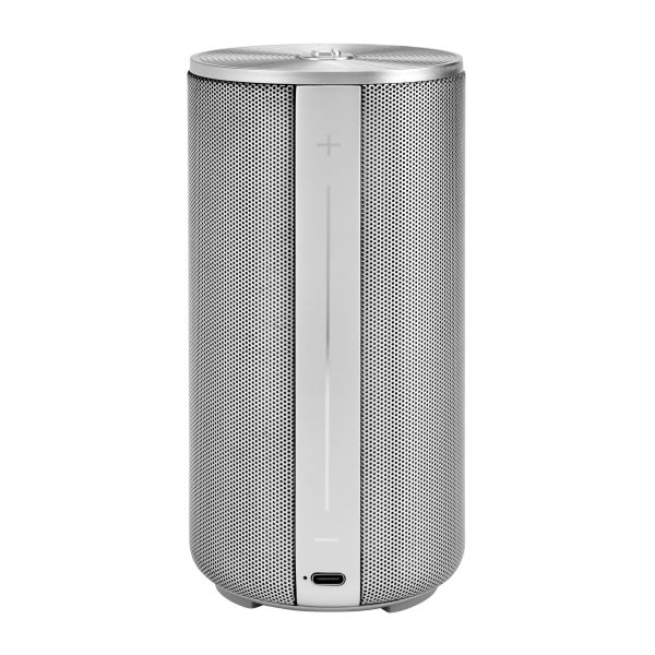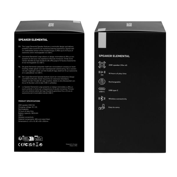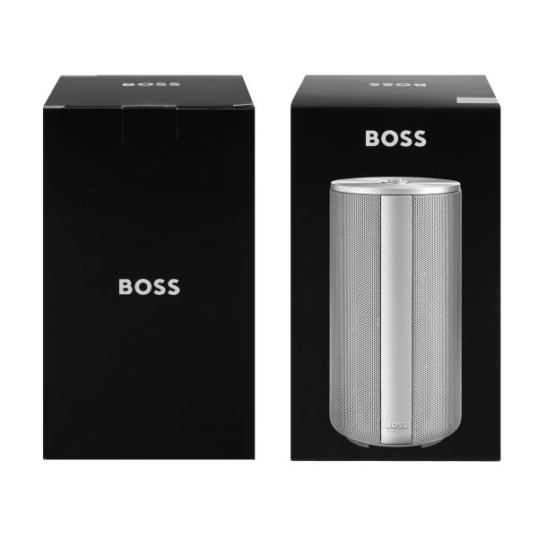 The Elemental large speaker combines portability with a refined, architectural presence, highlighted by its metallized finish and clean vertical detailing. The Double B logo crowns the main control button, while the subtle BOSS signature grounds the design. Delivering a clear and engaging 20 W output (2?10 W), the speaker offers ten hours of autonomy and convenient USB-C charging. Available in black, silver, and metallized camel.