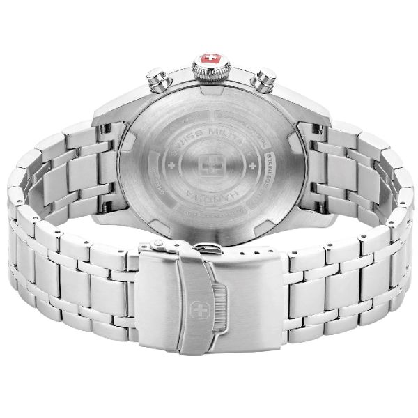 This Swiss Military Hanowa watch has a case made of stainless steel with a diameter of 43 mm and is fitted with a stainless steel band. Inside the case lies a Soprod movement and the watch features a Sapphire crystal. The watch is 10 ATM. This means the watch is suitable for swimming. The watch comes with Swiss Military 3+2. * Swiss Military 3+2 3 + 2 year warranty on Swiss Military Hanowa watches Swiss Military Hanowa watches come standard with a 3-year warranty. When you register your new watch via the Swiss Military website www.swissmilitary.ch you will receive an additional 2 years of warranty for free. All information can be found on the warranty card with your purchase.