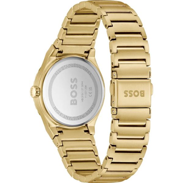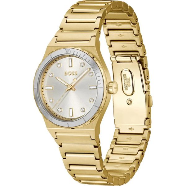 This Hugo Boss watch has a case made of stainless steel with a diameter of 32 mm and is fitted with a metal band. Inside the case lies a Miyota..