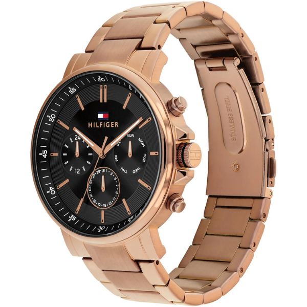 Gender Men Movement Made Japan Movement Quartz Functions Multifunction Case Diameter43mm Dial Type Analoque Case Material Rose Gold Plated Steel Dial Color Black Bracelet Material Rose Gold Plated Steel Water..