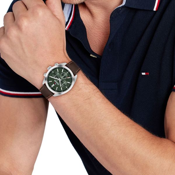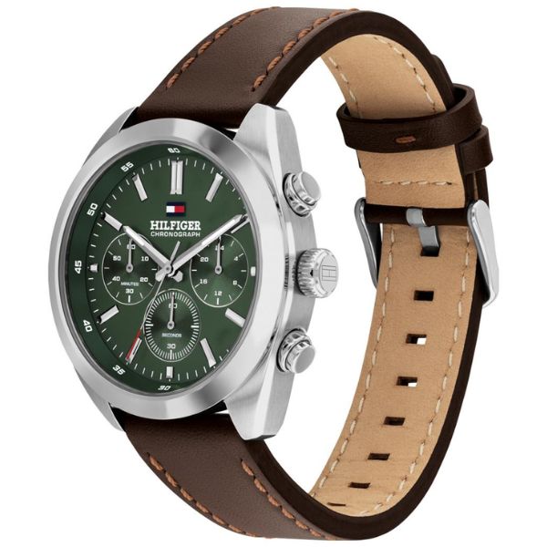 Gender Men Movement Made Japan Movement Quartz Functions Chronograph Case Diameter40mm Dial Type Analoque Case Material Stainless Steel Dial Color Green Bracelet Color Dark Brown Bracelet Material Leather Water Resistance50..
