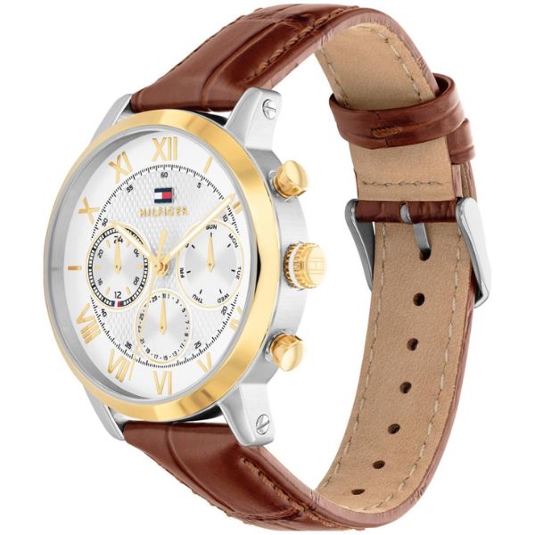Gender Men Movement Made Japan Movement Quartz Functions Multifunction Case Diameter42mm Dial Type Analoque Case Material Two Tone Plated Steel Dial Color White Bracelet Color Light Brown Bracelet Material Leather..