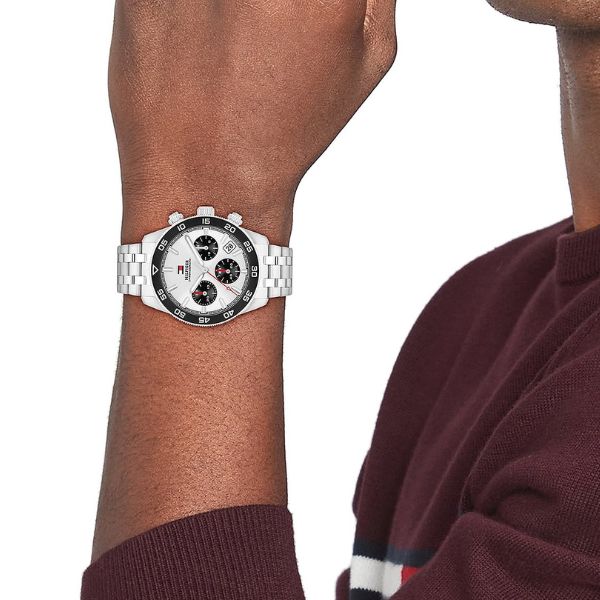 * Case Size: 41mm * Case Thickness: 11.80mm * ATM: 5 ATM * Dial: Polished enamel dial with branded TH Monogram, fine CD cut sub eyes, applied indexes, and date window. * Attachment: Link Bracelets & Leather Straps * Finishes: SS * Movement: Japanese Chronograph with date window - Epson VR32 B15 (M)/ 4-5H