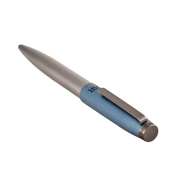 The Cerruti 1881 pen in navy and gun, in its ballpoint version, features a brushed cap engraved with the RR logo of the new branding, contrasted by a smooth, luxuriously plated lower barrel in gunmetal. The rich navy tone paired with the darker metallic finish creates a refined, contemporary contrast, offering a sophisticated and distinctive everyday writing piece.
