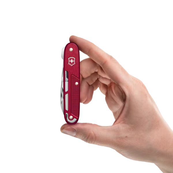 The essential pocket knife, modernized We designed the Synergy Alox as part of our Alox Refined collection. The goal is to offer ultimate versatility in a modernized and minimalistic design. Inspired by the idea of finding the perfect synergy between design, functionality and innovation, this pocket knife packs nine essential functions in a compact design. Ideal for those seeking an essential tool configuration for everyday use, the Synergy Alox is available in three colors: red, dark blue and silver. * Lock Blade, large / Box Opener / Screwdriver 3 mm / Nail file / Nail cleaner / Bottle opener / Screwdriver 7 mm / Wire stripper / Carry clip * Height: 17 mm * Length: 93 mm * Width: 23 mm * Weight: 77 g