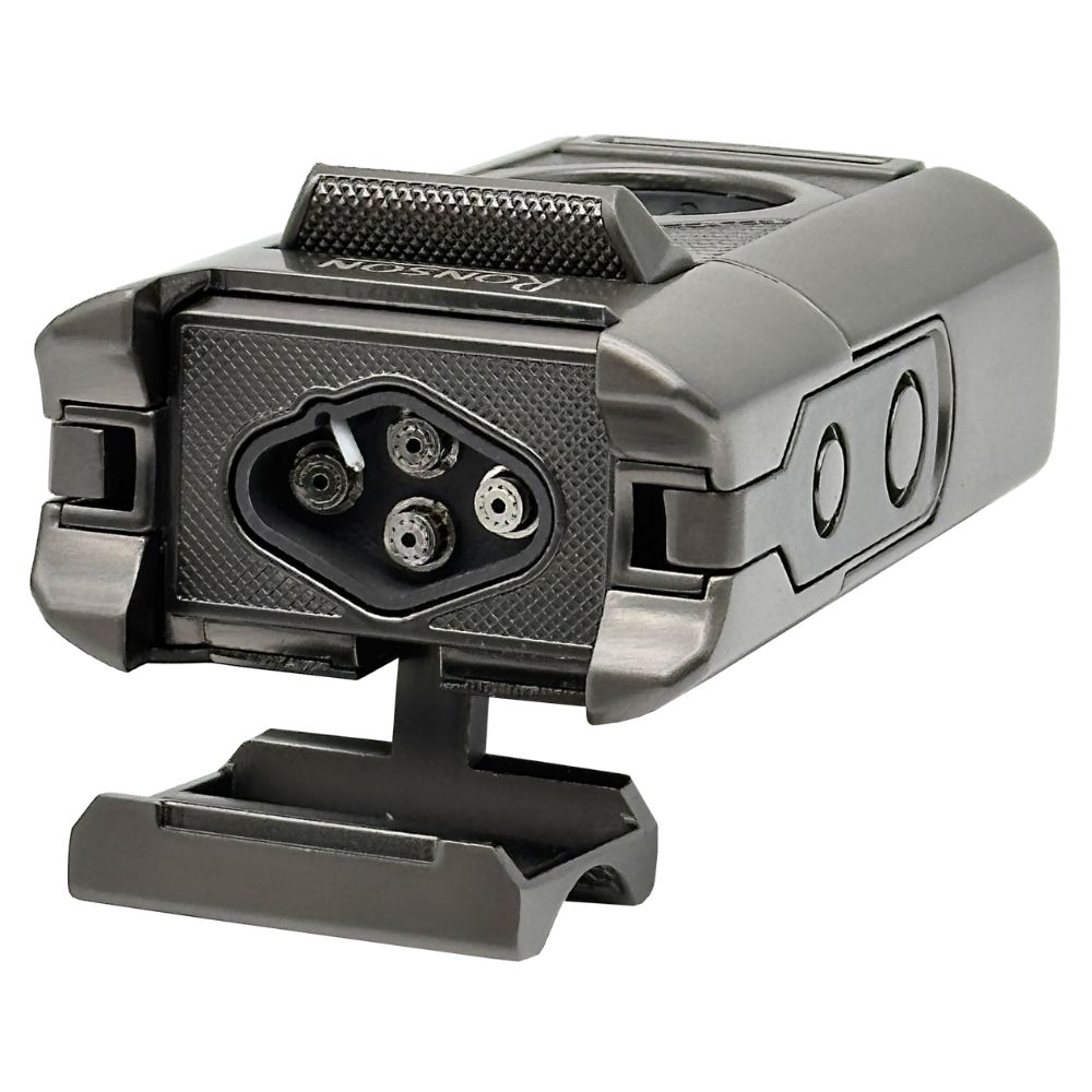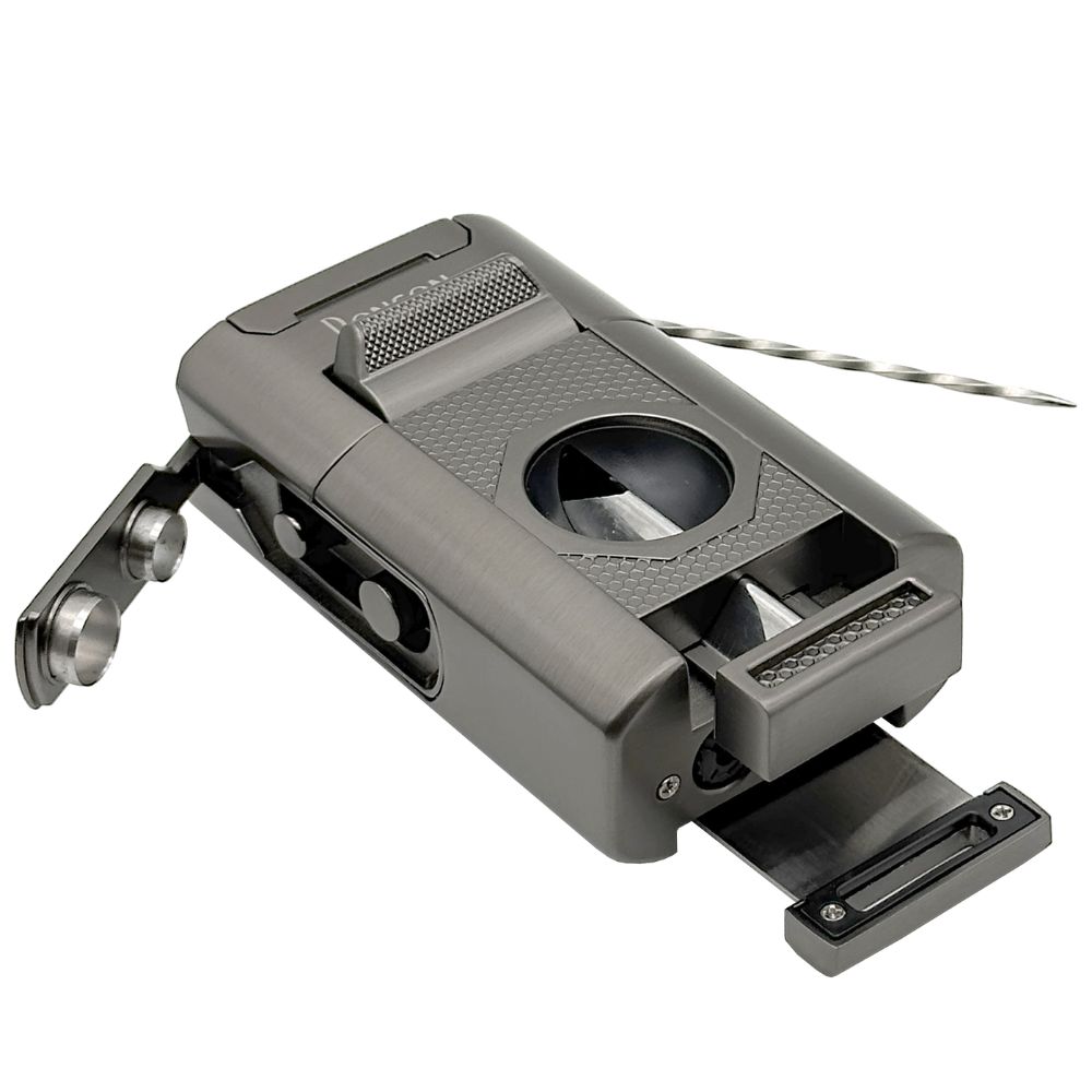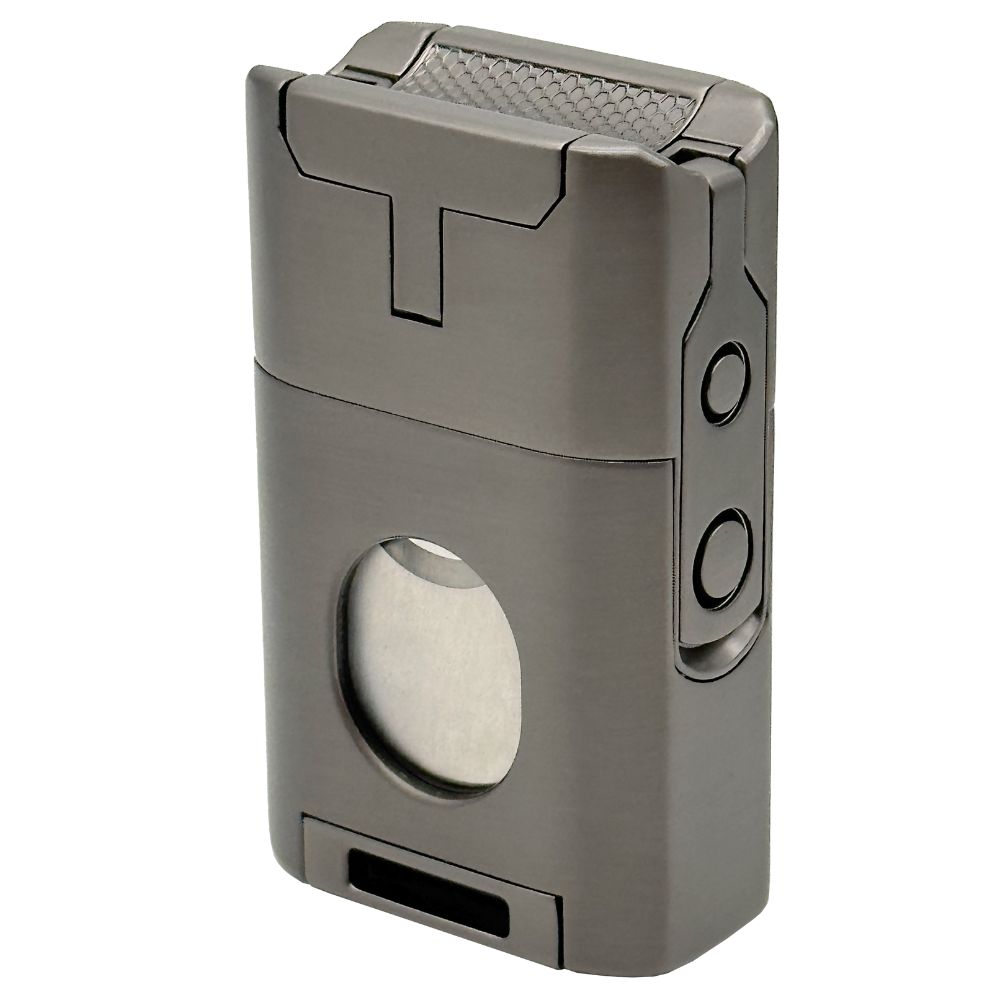 A lighter with Jet Flame ignition. Features with 4 nozzles providing intense flame. Equipped with 2 sliding cigar cutters for maximum convenience a straight and a V- Cutter, plus an..